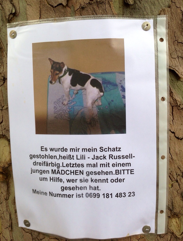 Hunde entführen und Lösegeld verlangen (hier im Bild ein Such-Aufruf vom 1.7.2014 in der Währingerstr.) ist keine gute Geschäftsidee!!!