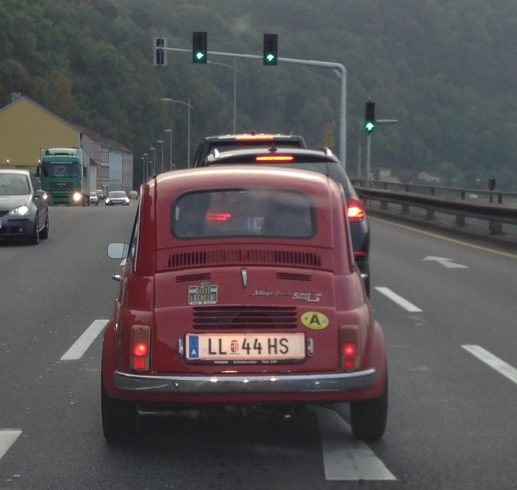 Das Foto zeigt einen PUCH 500, aufgenommen am gestrigen Samstag in Linz: BITTE LÄCHELN steht am Heck, müßig, darauf hinzuweisen 😉