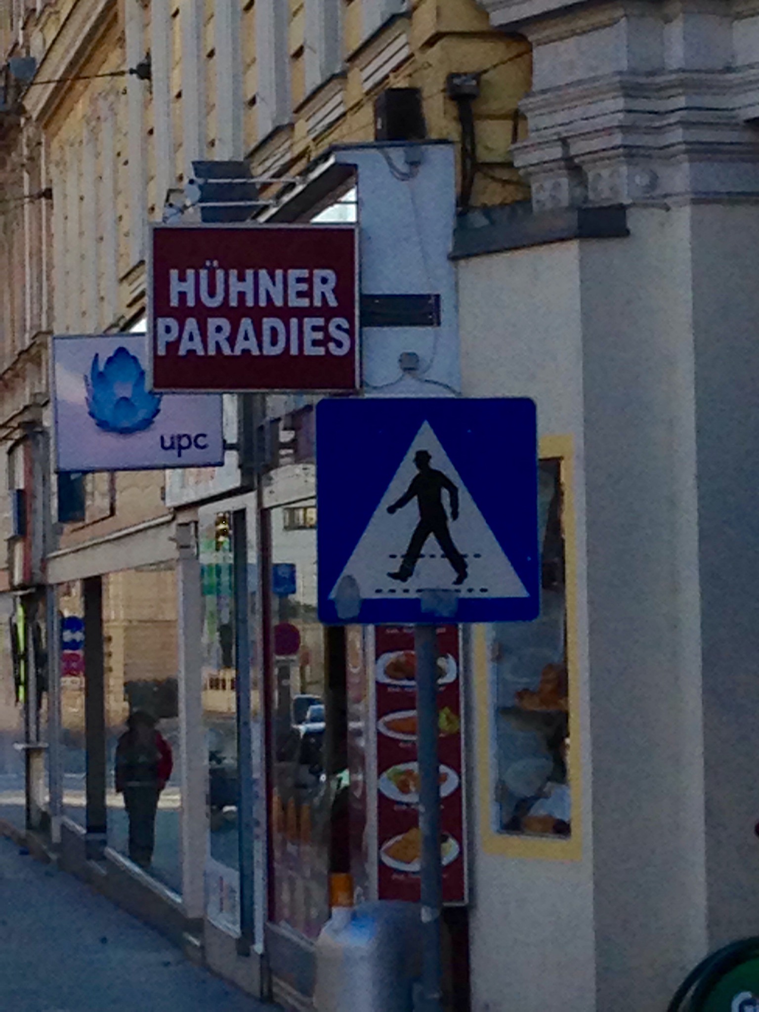 Aufpassen bei der Namenswahl: neben einem FußgängerInnen-Übergang (zB an der verkehrs- und staureichen Alserbachstraße) sollte die „Geflügel-Re-Inkarnationsstelle“ (vulgo „Imbiss“) besser Gänsemarsch genannt werden: bei Hühnerparadies erwarte ich doch eher einen Freilandgemüse-Hühner-Bauernhof 😉