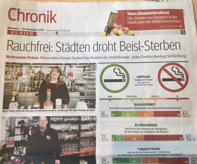 Was den Nicht-RaucherInnen-Schutz betrifft ist Österreich leider Schlusslicht in der OECD und EU, aber die „Verschärfungen“ der vielen (meiner Meinung nach ohnehin zahnlosen) gastronomie-relevanten Gesetze ist sicher nicht Schuld daran, dass in diesem Jahr ein Beisel-Sterben für einen Gesundschrumpfungsprozess sorgen wird (vgl. Artikel im KURIER, beiliegend).