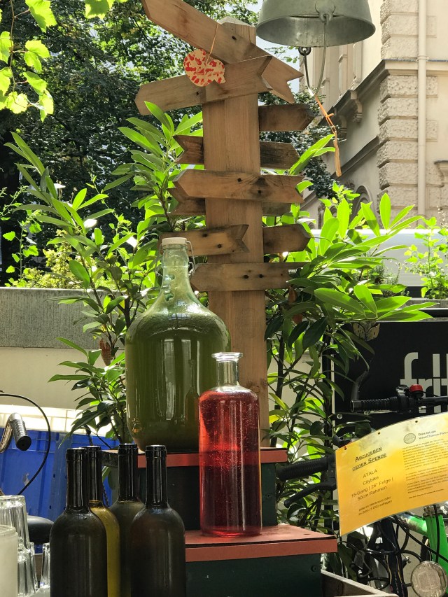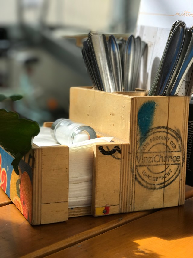 Das „mittendrin“ der VinziRast im 9. Bezirk ist ein feines Sozialprojekt (Wohnheim mit Werkstatt, unter anderem für Fahrräder!) in dem auch ganz toll gekocht wird! …und zum Menü gibt’s bei den „Tagesgetränken“ (Himbeerwasser und hausgemachte Limonana!) um €1,50- ein kostenloses „Refill“ dazu! 😀