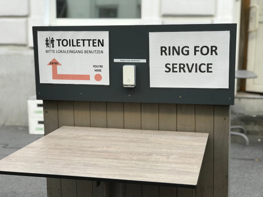 Auch eine nette Art den „verlorenen Seelen“ im Gastgarten entgegen zu kommen… „Klingel, wenn Du was brauchst!“ 😉 …..ob sich das wohl auch in anderen Bereichen unseres Lebens durchsetzen wird? 🤔