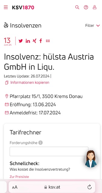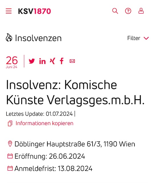 Eine ausgewachsene Wirtschaftskrise ist daran erkennbar, dass auch die großen Firmen, die bekannten Unternehmen, die „etablierten Player“ Konkurs anmelden. In den letzten Tagen waren das z.B. JOLLY DAYS (21 Jahre am Markt für „Events und Erlebnisse in der Box“), HÜLSTA (Möbel und Küchen), der VERLAG DER KOMISCHEN KÜNSTE (selbstredend) und natürlich auch wieder ein paar Unternehmen aus der SIGNA-Gruppe…